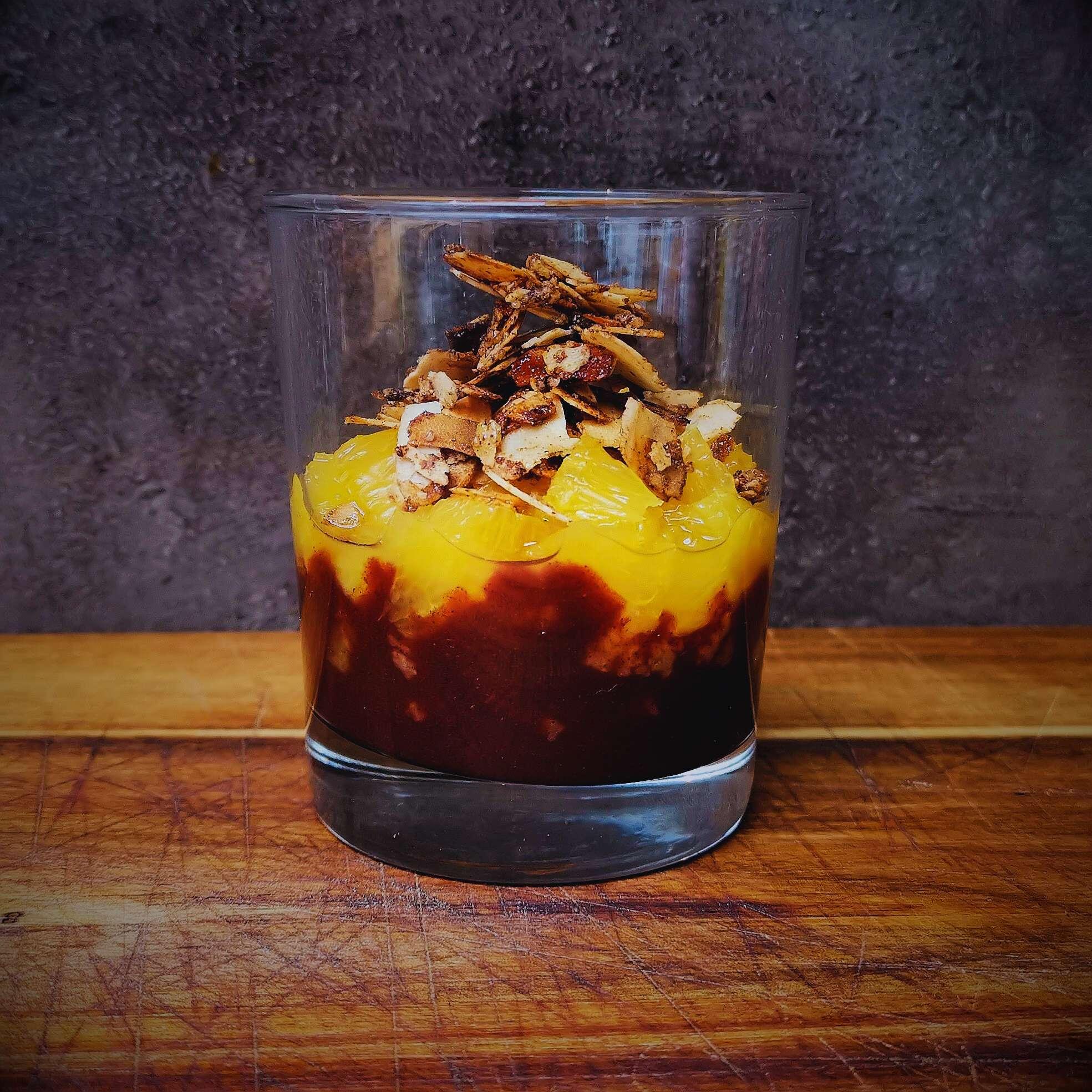 - appelsien met glühweincoulis, marsepein en amandelcrunch