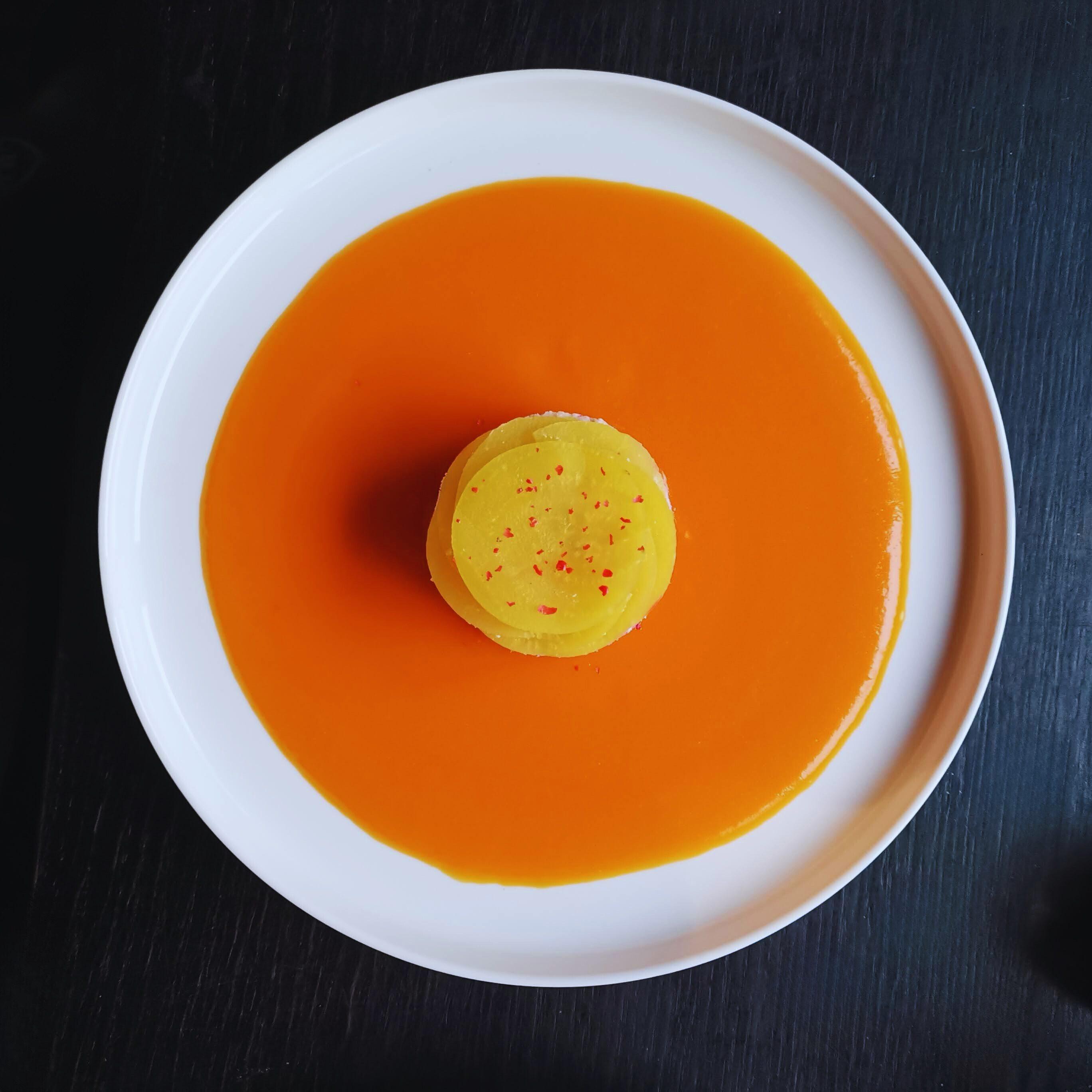 - kruidencrumble met geroosterde pompoen, gele biet en sinaasappelcoulis