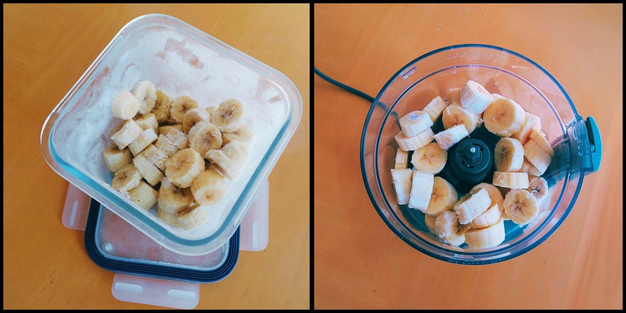 - Laat je stukjes bevroren banaan een kwartier tot een half uur zachter worden op het aanrecht (maar niet echt ontdooien).