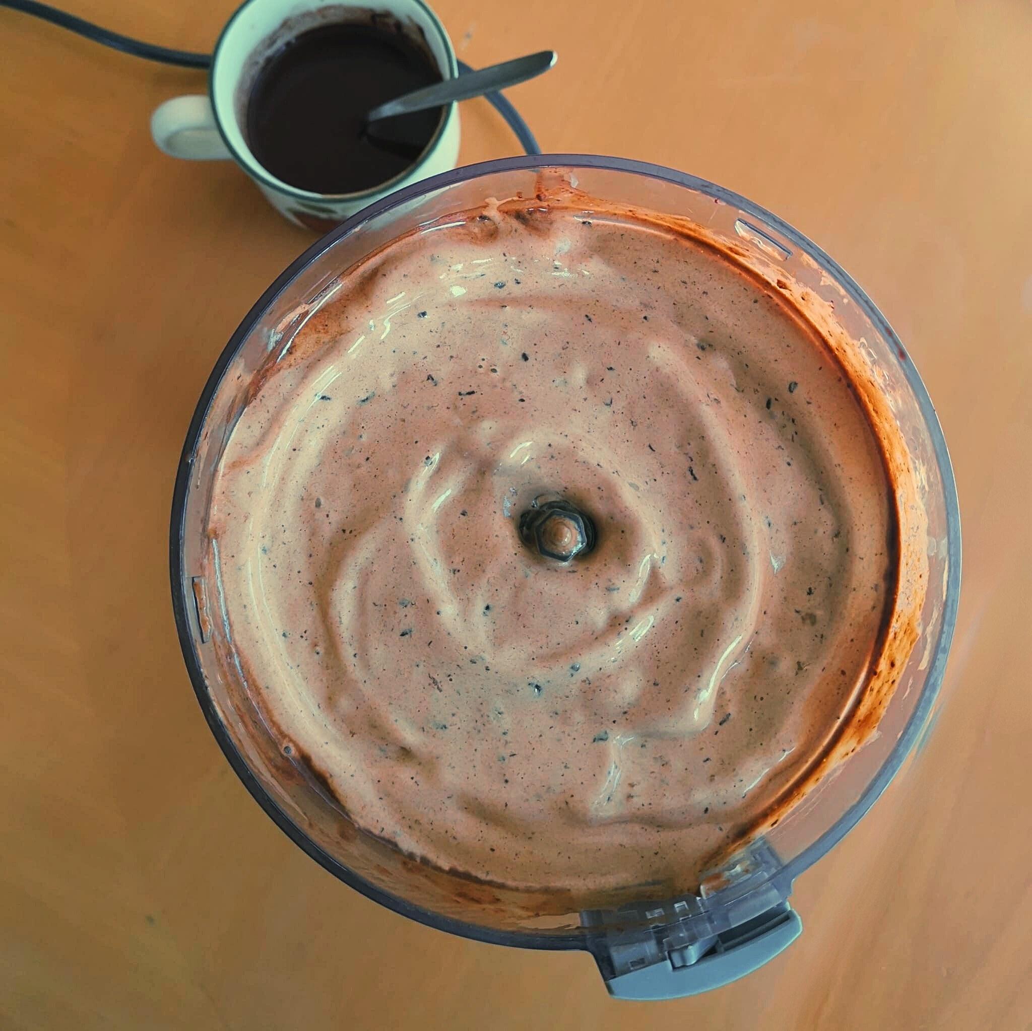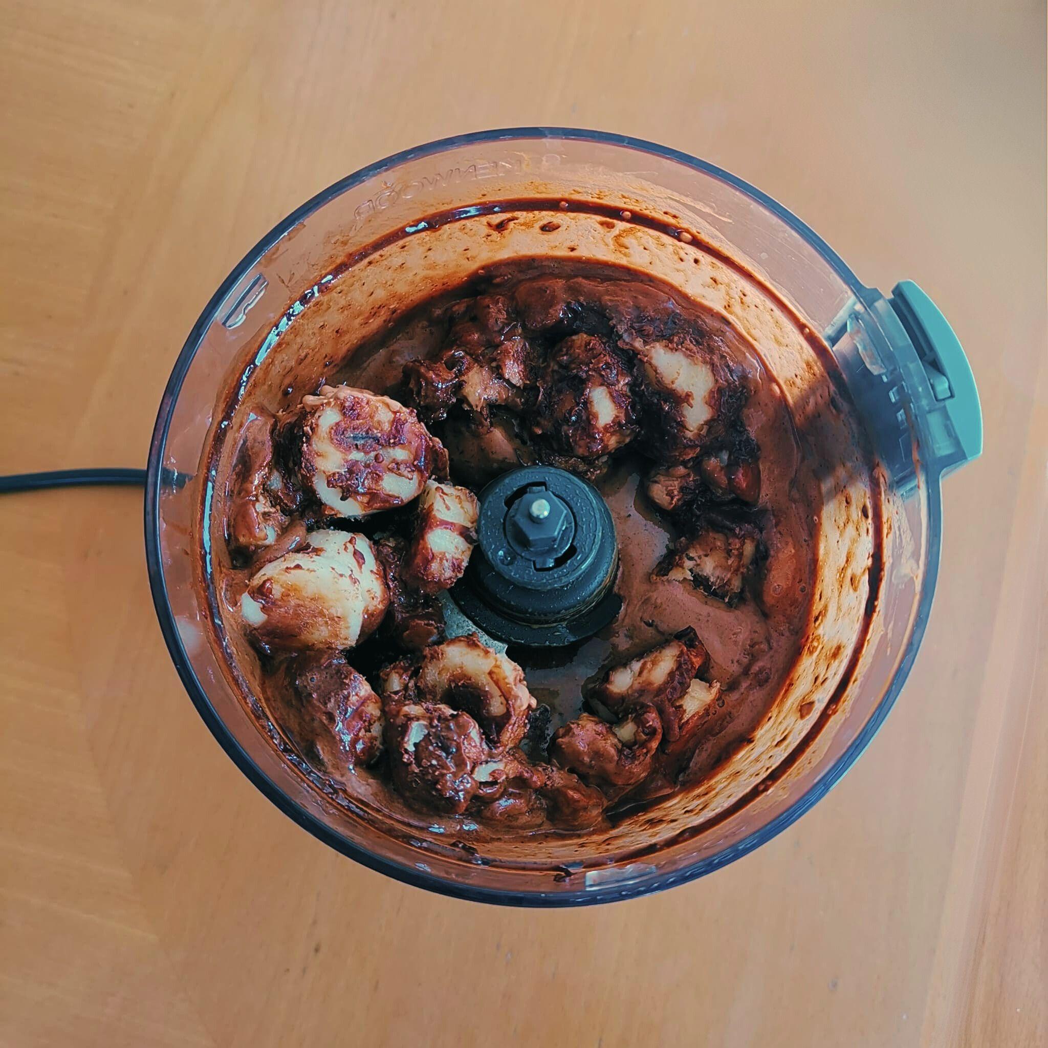 - Wanneer het banaan-koffie-mengsel een koud papje met nog wat mini chocolade stukjes is geworden, zet je de hakmolen uit. Soms moet je tussendoor wat banaan van de wanden duwen, dus hou je machine wat in de gaten.