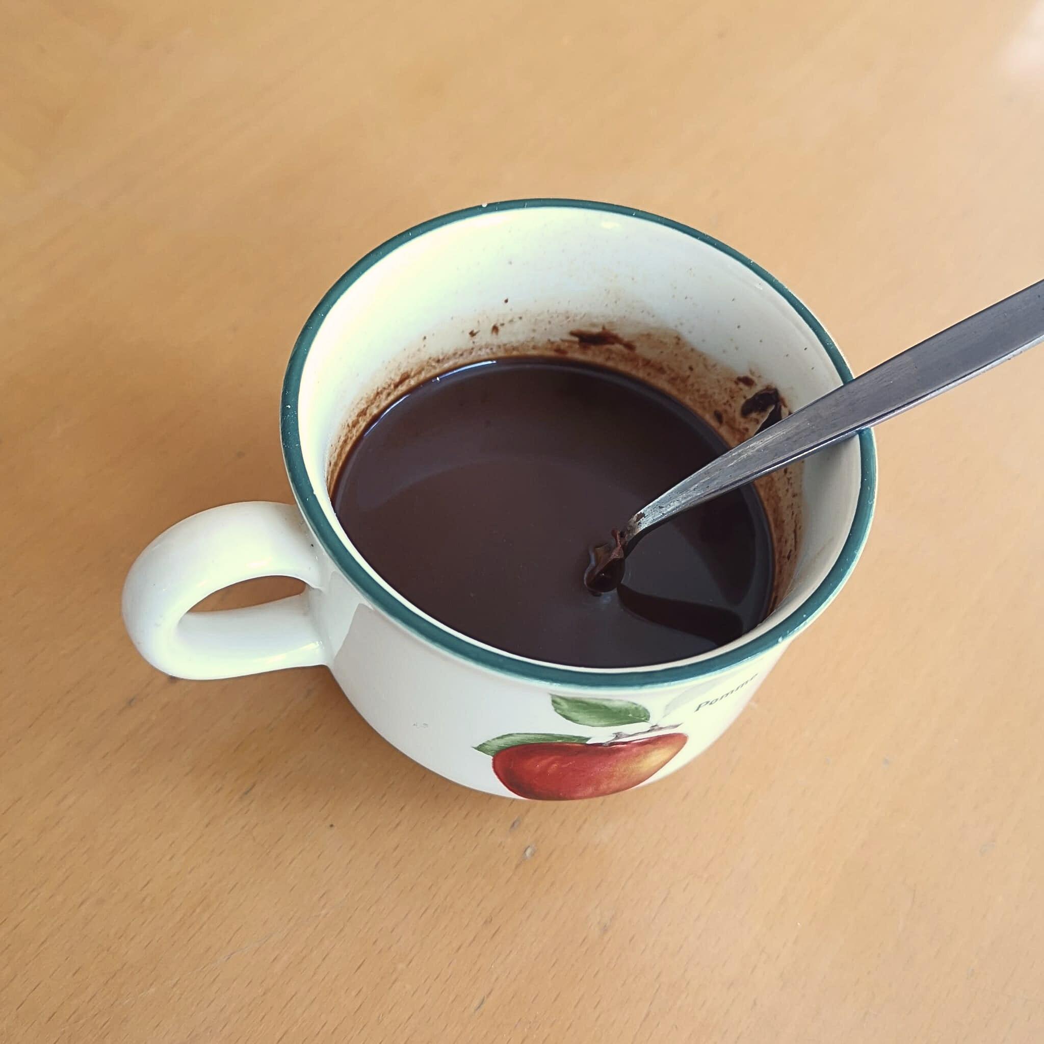 - Schep de oploskoffie in een tas en overgiet met bodempje kokend water: ongeveer een bodempje van de tas.