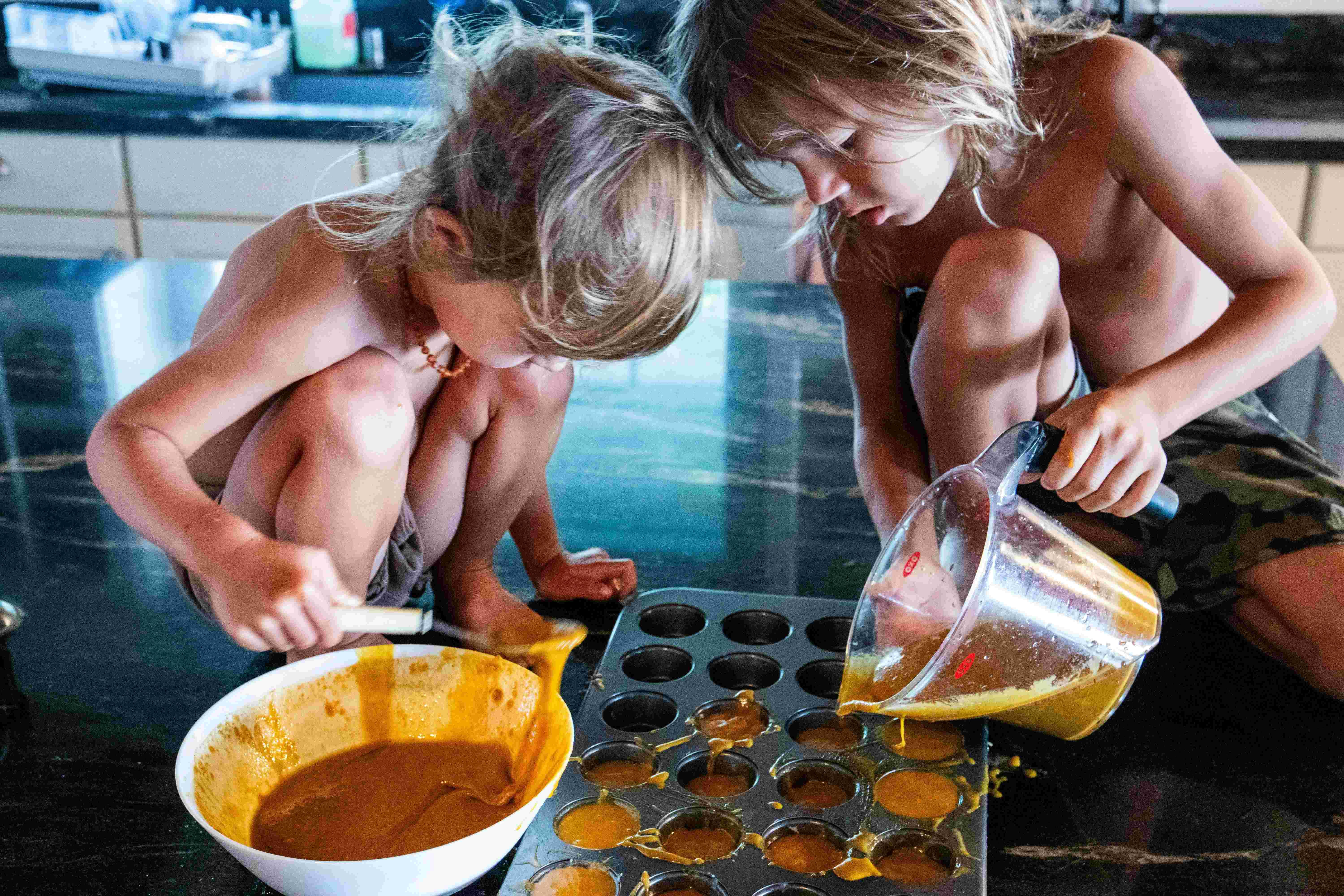 - Bij glutenvrij beslag is het meestal onmogelijk om je beslag te overmixen (in tegenstelling tot heel wat glutenvolle degen). Je kan dus gerust alles bij elkaar kappen en nog wat extra rondjes in de mixer laten draaien om er eventuele klonters zo goed mogelijk uit te krijgen. En zie je bij het in de vorm gieten toch een klontertje? Dan is dat snel opgelost door het plat te duwen met een koffielepel.