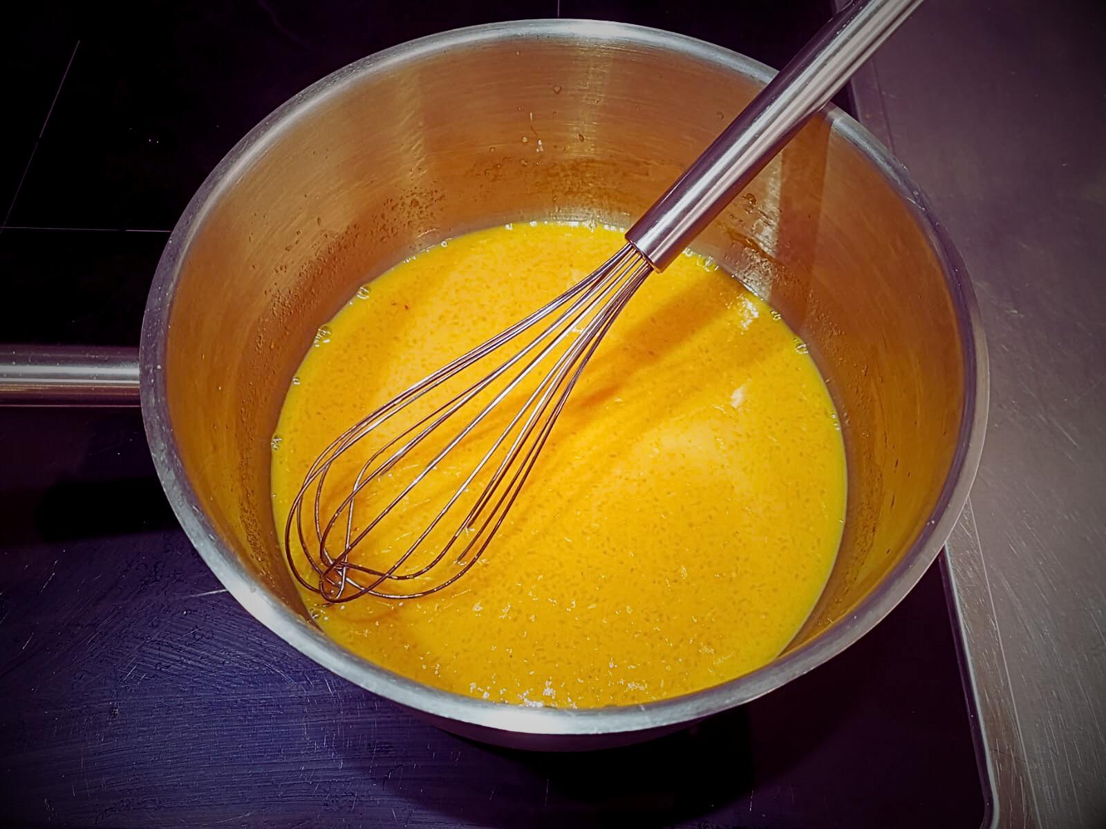 3. Breng op een mediumvuur aan de kook, regelmatig roerend met de garde. Roer meer en meer naarmate het begint in te dikken.