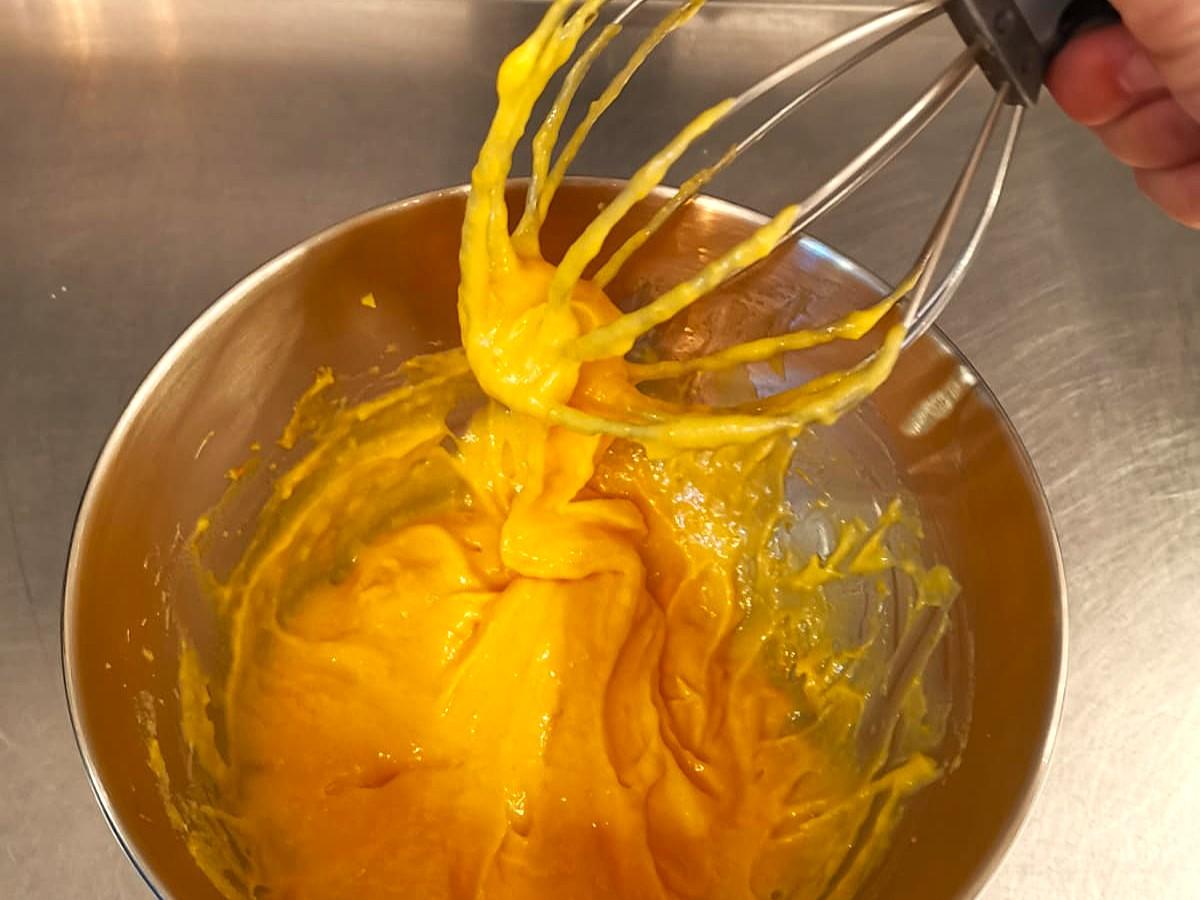 2. Voeg je natte ingrediënten toe en roer tot een zo homogeen mogelijk mengsel met de garde.